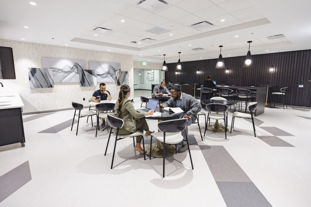 Two men are walking on a sidewalk, engaged in conversation. One is wearing a beige polo shirt and black pants, holding a paper. The other is wearing a light blue polo shirt and blue pants. Trees and a building are in the background. Five people in green medical scrubs stand together smiling in front of a building labeled "South College". They are outdoors, standing side by side with arms around each other. The surroundings include a glass door and the partial view of a garden. A modern, open-concept student lounge with white walls and ceiling, featuring several small tables and chairs. Four people are seated at different tables, using laptops and engaging in discussions. The space is well-lit with hanging pendant lights and has contemporary decor.